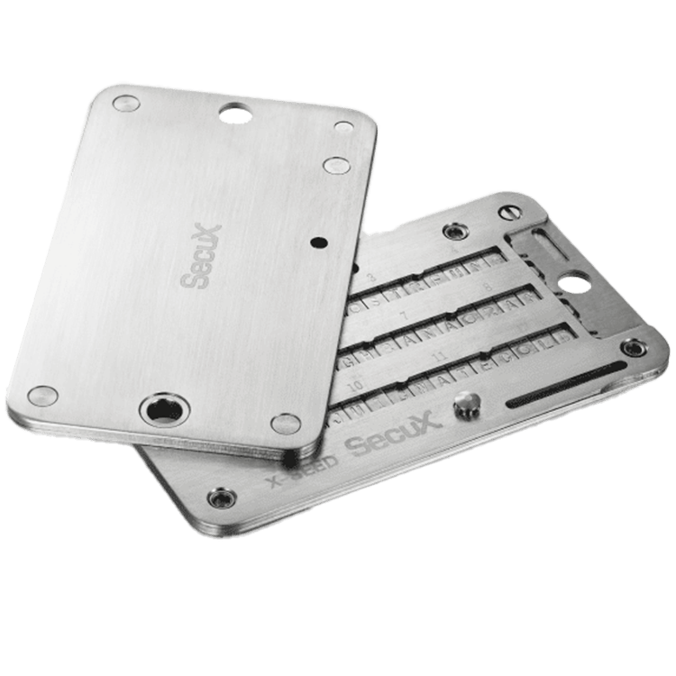Es importante mantener tu semilla de recuperación correctamente y protegida porque tu semilla de recuperación es la única manera de acceder a tu monedero de nuevo si has perdido el acceso. Por ejemplo, porque su portátil está roto en el caso de un monedero de software, su monedero de hardware está roto o perdido o ha perdido el código de acceso. Almacenar la semilla en línea es posible, pero da a los hackers la oportunidad de obtener acceso. Por esta razón, usted quiere mantener la semilla de recuperación fuera de línea. Esto supone un nuevo reto: ¿cómo proteger la semilla de los daños causados por el fuego y el agua? Esto se consigue almacenando la semilla de recuperación en una copia de seguridad de semillas como la X-Seed Pro. Las letras y el sistema de almacenamiento son de acero inoxidable 304 y sólo se funden a 1454°C.