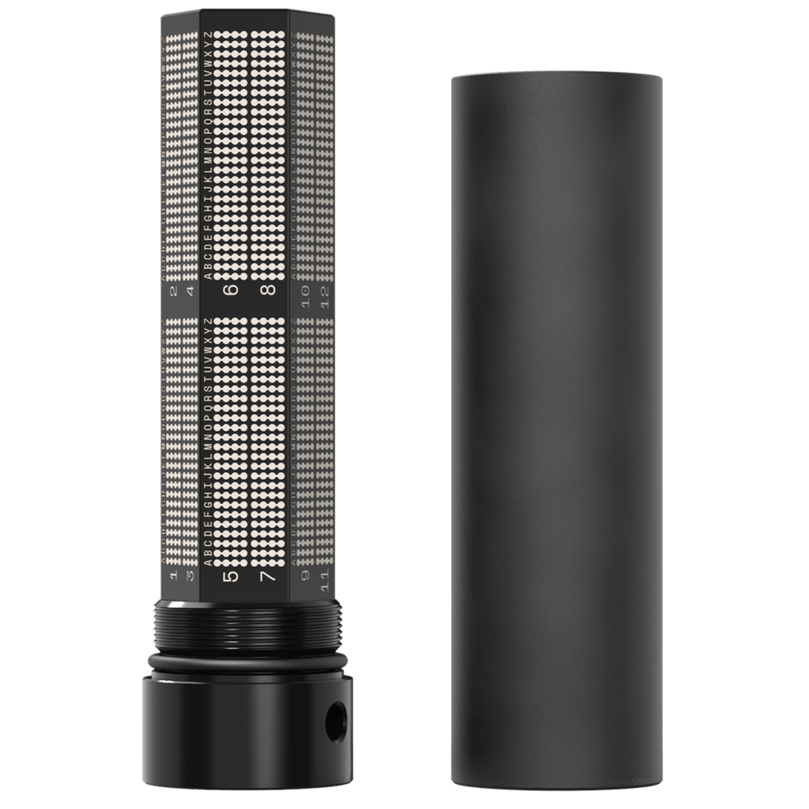 De constructie bestaat uit twee onderdelen: een binnendeel waarop je de letters ponst, en een buitenste cilinder die er stevig overheen wordt geschroefd. Het geheel is zwart gecoat, wat een opvallend voordeel biedt: van buitenaf is op geen enkele manier zichtbaar wat erin staat. De Keep Metal heeft hierdoor een zeer discreet, “stealth” uiterlijk.