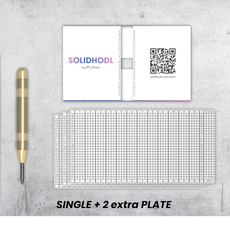 SOLIDHODL (SINGLE): 1 placa SOLIDHODL, 1 manga (para evitar erros durante a gravação), 1 punção (para gravar as letras no aço inoxidável)